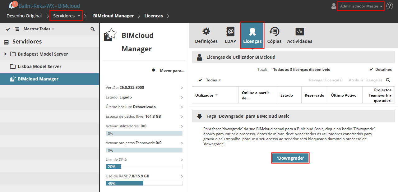 Na página Servidores, seleccione o BIMcloud Manager (Ou clique em Verificar no assistente de Downgrade para o levar até lá).