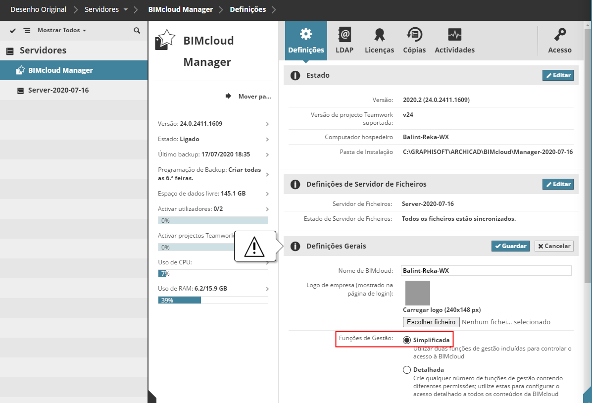 Se este passo se aplicar a si, será apresentado com um triângulo de aviso vermelho e é automaticamente reencaminhado para a página certa do BIMcloud Manager onde poderá ajustar as definições segundo com as indicações.