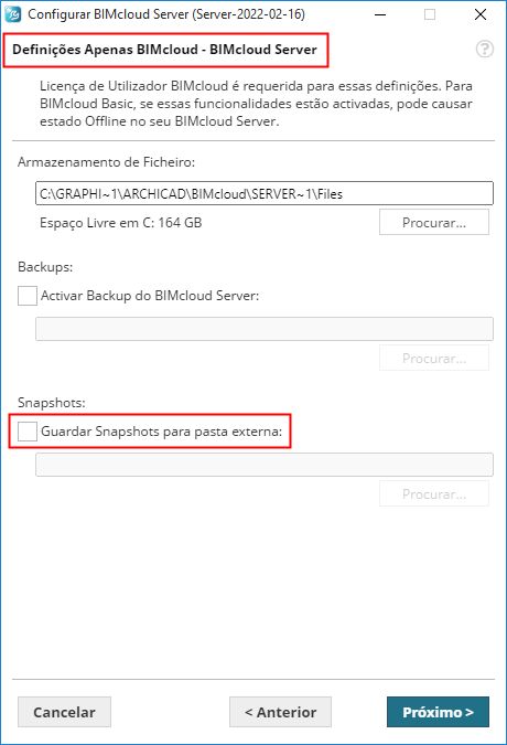 A opção para gravar Snapshots para uma pasta externa não está disponível em BIMcloud Basic.