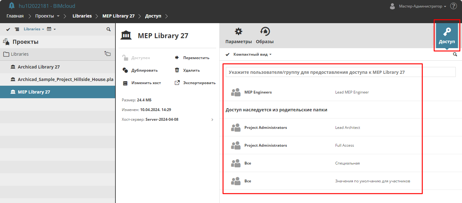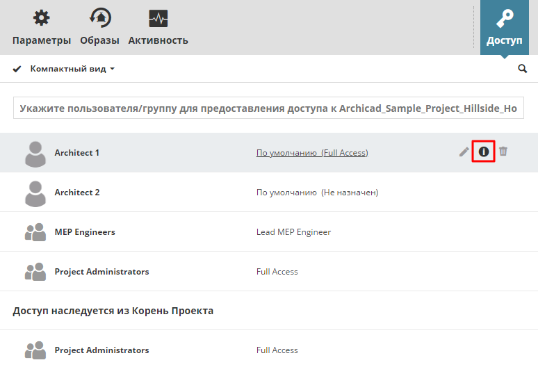 Выберите элемент BIMcloud Manager. В панели Доступа отображается список пользователей или групп, имеющих право доступа к выбранному элементу.