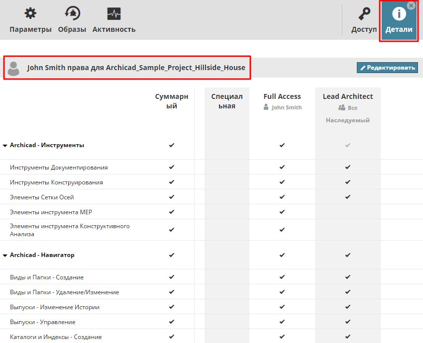 На странице Деталей отображаются все права данного пользователя с разбивкой по ролям.