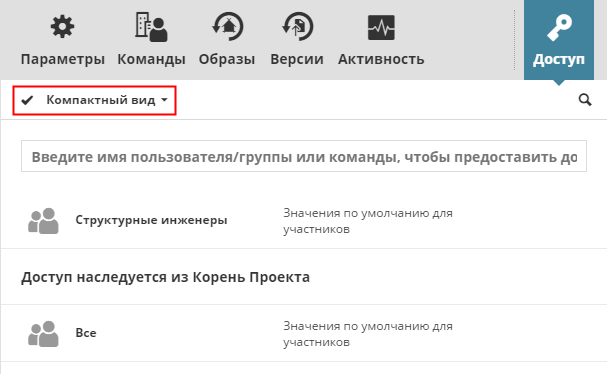 - В верхней части списка отображаются пользователи/группы, которым был предоставлен доступ к данному элементу (администратор добавил их вручную - см. Предоставление доступа)