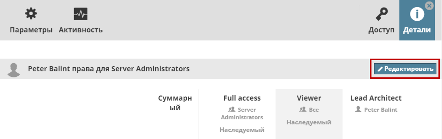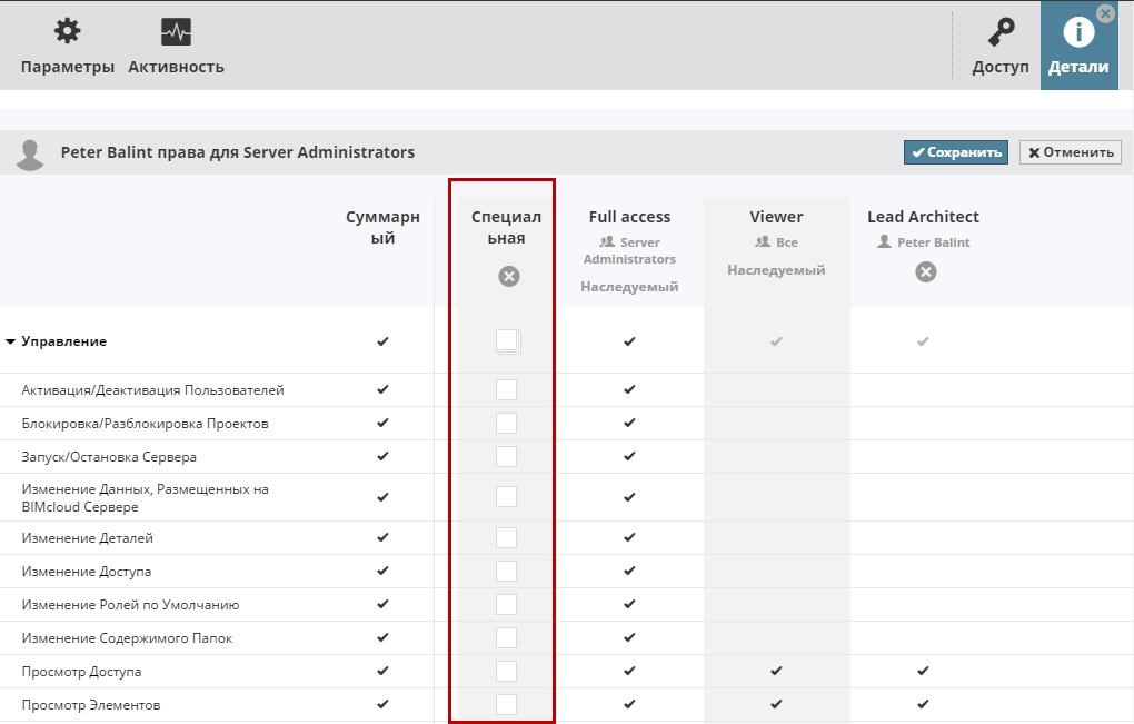 При этом будет автоматически открыта страница Деталей, на которой можно отметить нужные права специальной роли, назначаемой выбранному пользователю/группе (см. ниже).
