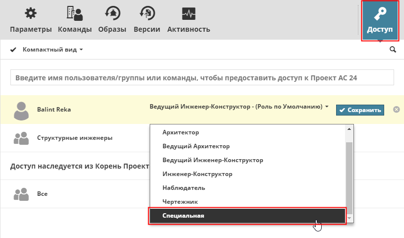 Иногда удобнее предоставить кому-то определенные права доступа к элементам, не сохраняя этот набор прав в качестве новой стандартной роли. В этом случае, предоставляя Доступ, выберите из выпадающего меню вариант Специальная и нажмите кнопку Сохранить.