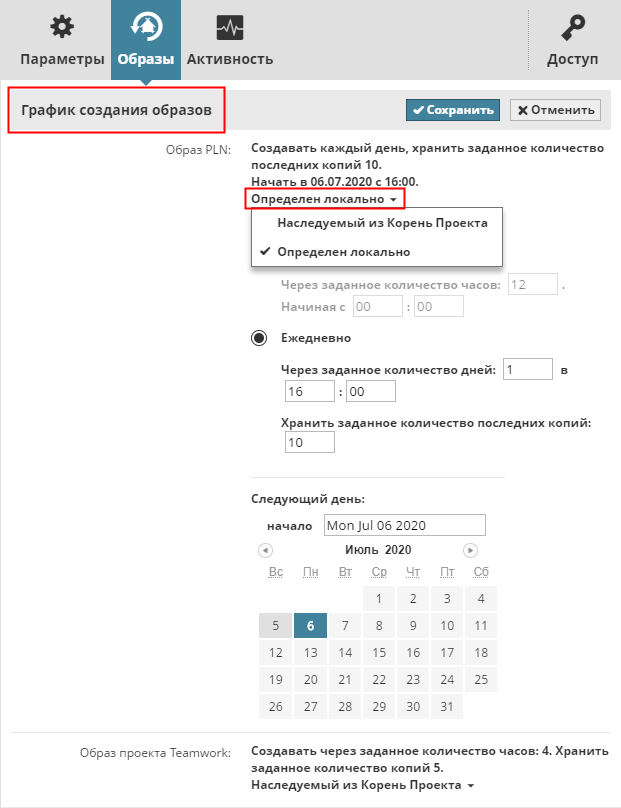 Определен локально: настройте график создания образов на локальном уровне, чтобы отменить настройки создания образов родительской папки