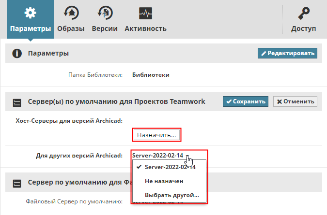 Для всех других версий Archicad (которым вы не назначили определенный хост-сервер): используйте значение по умолчанию или воспользуйтесь выпадающим списком для выбора другого хост-сервера.