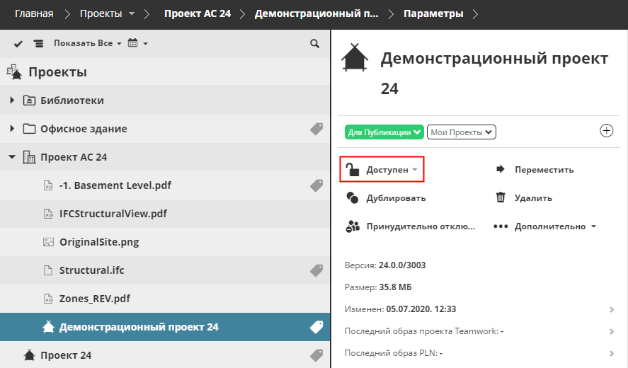 На странице Проектов в BIMcloud для выбранного проекта отображается следующая информация: