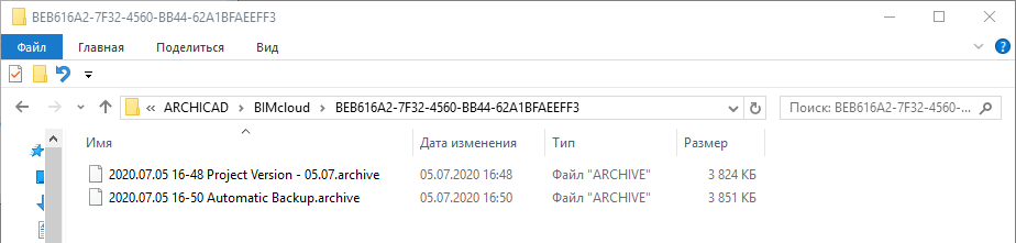Файлы образов проектов обоих типов (образы Проектов Teamwork и образы PLN) сохраняются с расширением .archive в папке Projects > [номер ID] > Backups, находящейся в месте установки BIMcloud Server.