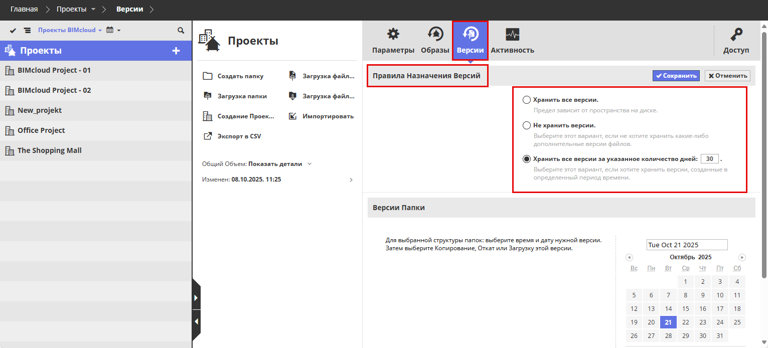 Прим.: версионность можно настроить только на верхнем уровне корневой папки Проектов. Заданные здесь параметры будут применяться для всех файлов и папок, находящихся на странице Проектов.Выберите правило: