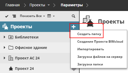 Эта команда доступна на странице Проектов при выборе корневой или любой другой папки.