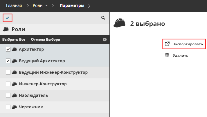 - Выберите роли, которые хотите экспортировать.Прим.: чтобы выбрать несколько элементов в Навигаторе, сделайте щелчок на символе галочки, находящемся в верхней части страницы.