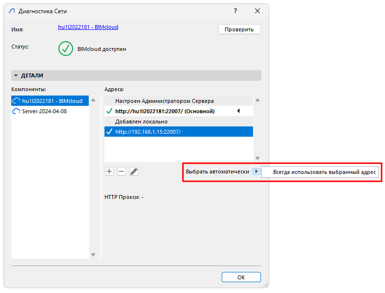Если подключение Archicad к данному серверу уже происходило (сервер присутствует в списке серверов), то происходит обычная установка автоматического соединения с использованием наиболее подходящего адреса.