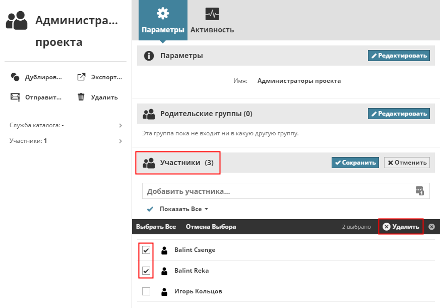 3. Отметьте тех Участников, которых хотите удалить из Группы (или активируйте команду Выбрать Все), затем нажмите кнопку Удаления.