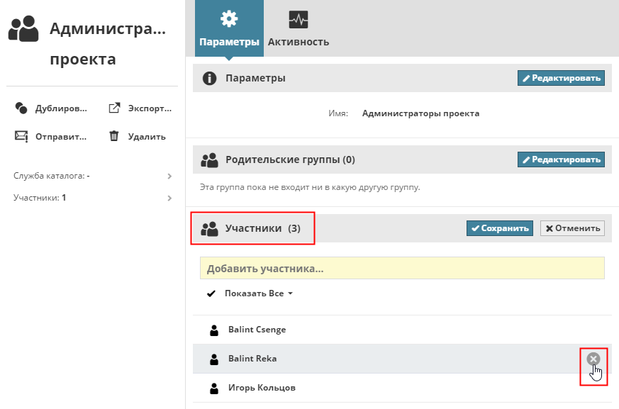 2. Наведите курсор на имя пользователя и нажмите кнопку X, чтобы удалить его из группы.