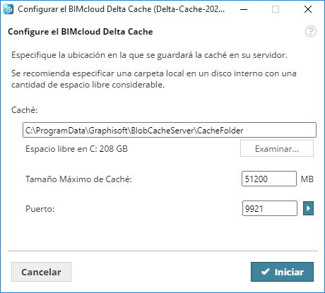 Tamaño Máximo de Caché: Inserte el tamaño máximo para los datos de caché. Cuanto más espacio asigne, más eficientemente va a operar el BIMcloud Delta Cache.