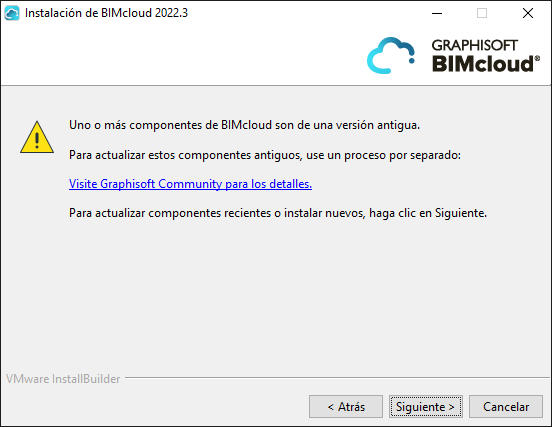 Si alguno de sus componentes de BIMcloud son de versiones antiguas, el instalador le avisará de que no puede actualizarlos directamente desde el instalador: