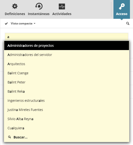 Abra el panel de Acceso y empiece a escribir el nombre de quien puede acceder a él (usuario o grupo), o haga clic en Buscar. Para otorgar acceso a todos los usuarios, utilice el grupo especial Todos.