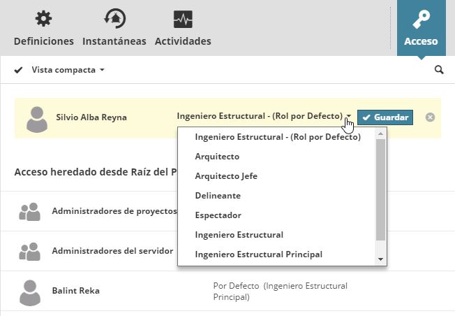 - Escoja un rol para el usuario o grupo seleccionado – esto define qué rol tendrá para el ítem seleccionado. (Cada rol es un conjunto de permisos. Defina y edite los roles en la página Roles) Usted puede: