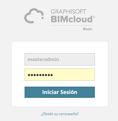 El nombre de inicio de sesión del Administrador Maestro es: masteradmin. La contraseña se definió durante la instalación del servidor, en el configurador del BIMcloud Manager. Si ha olvidado la contraseña, inicie el configurador del BIMcloud Manager y defina una nueva contraseña.