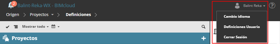 La cabecera contiene notificaciones sobre el BIMcloud y accesos directos para las definiciones de BIMcloud.
