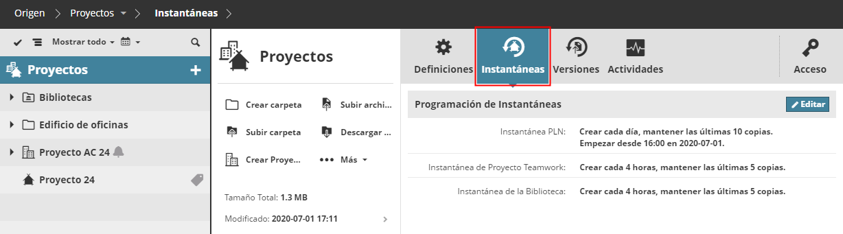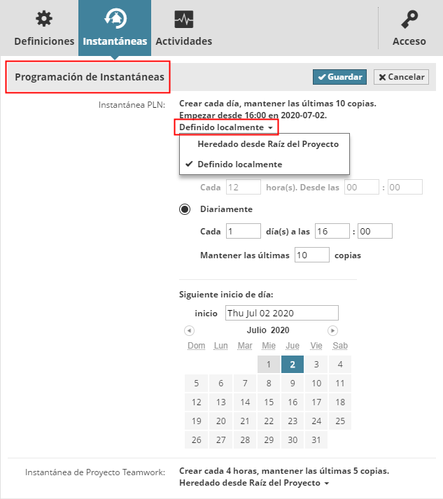 Programe Instantáneas automáticas en el panel de Instantáneas, a nivel de la raíz de Proyectos, o cualquier carpeta, o proyecto individual de Teamwork.