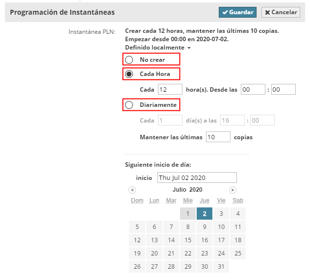• Cada Hora La instantánea se creará cada hora, basándose en las definiciones de abajo