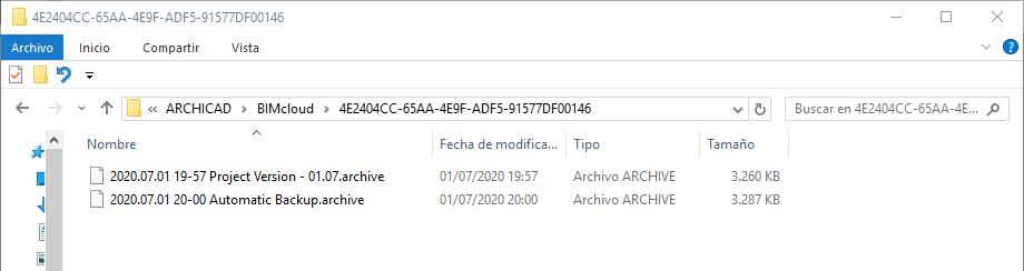Las Instantáneas de la Biblioteca son guardadas en Datos Adjuntos > [número ID] > Backups, en la ubicación donde instaló el BIMcloud Server, también con la extensión .archive.