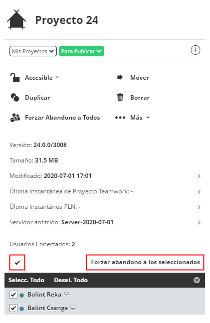 Compruebe los usuarios que desea forzar el Abandono del proyecto: El botón de “Forzar abandono a los seleccionados” está activado.