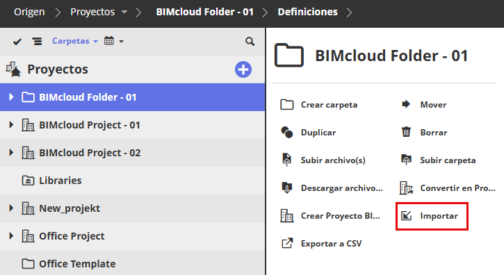 Puede importar un archivo de proyecto Teamwork (extensión .BIMProject) o un archivo de biblioteca (.BIMLibrary) en una carpeta seleccionada en BIMcloud.