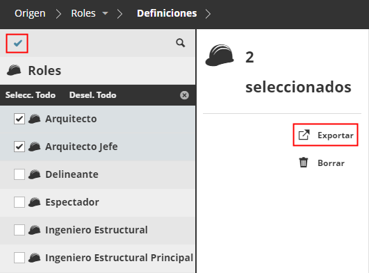 - Seleccione los roles que desea exportar.Nota: Para la multiselección de ítems en el Navegador, active las casillas haciendo clic en la marca de verificación de la parte superior de la página.
