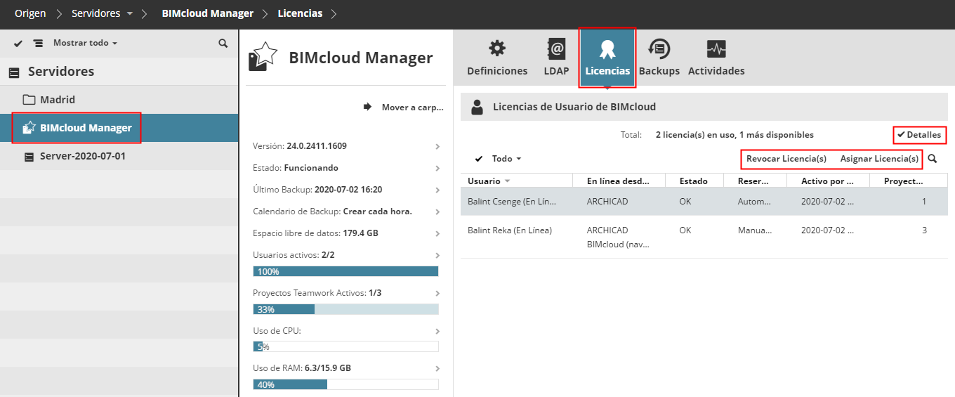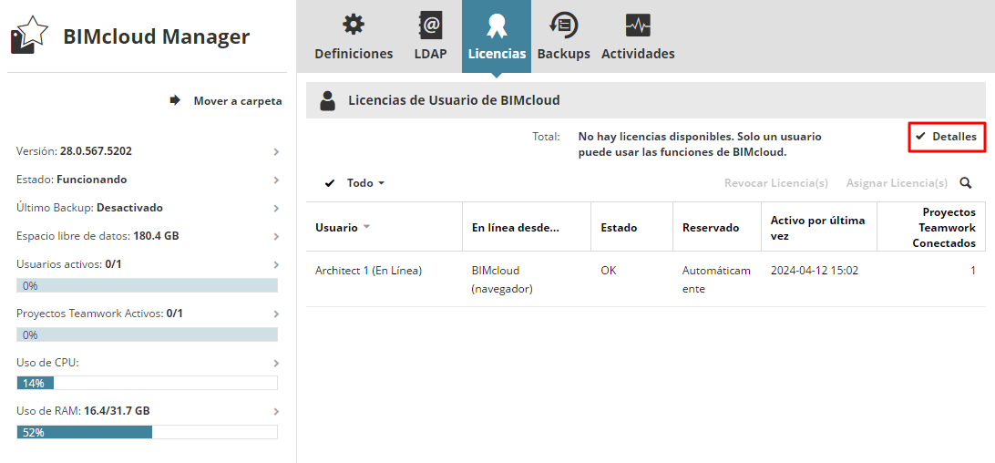Haga clic en el botón Detalles para obtener información general de todas las Licencias de su BIMcloud: