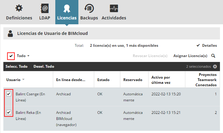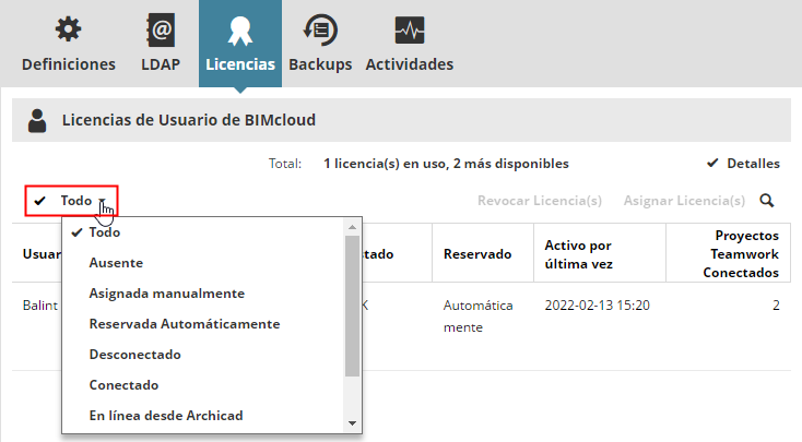 Esto nos muestra las Licencias de Usuario BIMcloud que se están usando, las disponibles y las desaparecidas.