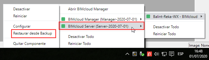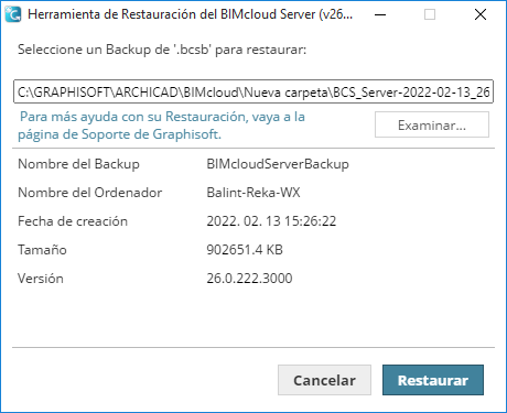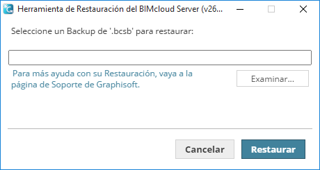 Nota: La ubicación del Backup se definió al configurar el BIMcloud Server o Manager. Ver ¿Dónde están los archivos de backup de servidor?.Haga clic en Restaurar.