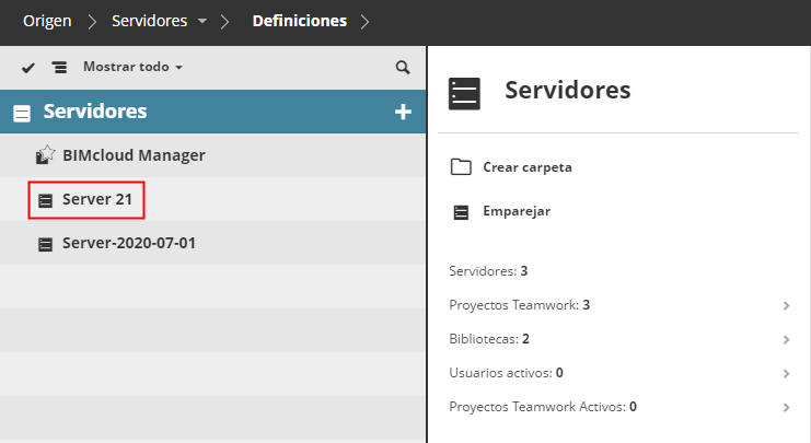 El BIMcloud Server aparecerá automáticamente en el Navegador del BIMcloud Manager.