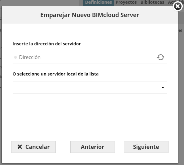 Vuelva a la interfaz web: el diálogo de Emparejar Nuevo BIMcloud Server.