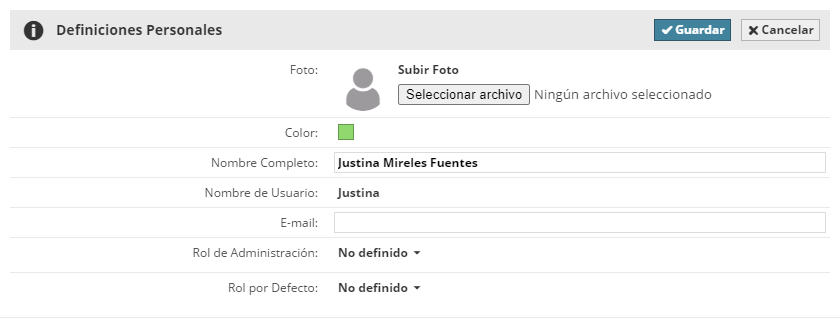 - Inserte la dirección email del usuario. Suba una foto opcional y defina un color de usuario.