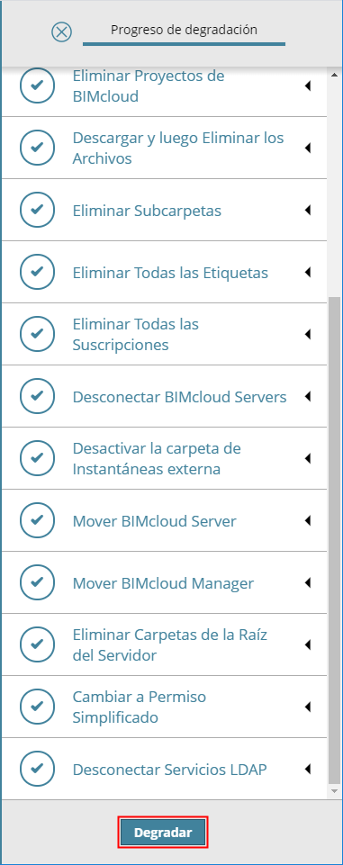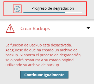 Para abortar el proceso de Degradación, haga clic en la X de la barra de progreso de la parte superior del Asistente.