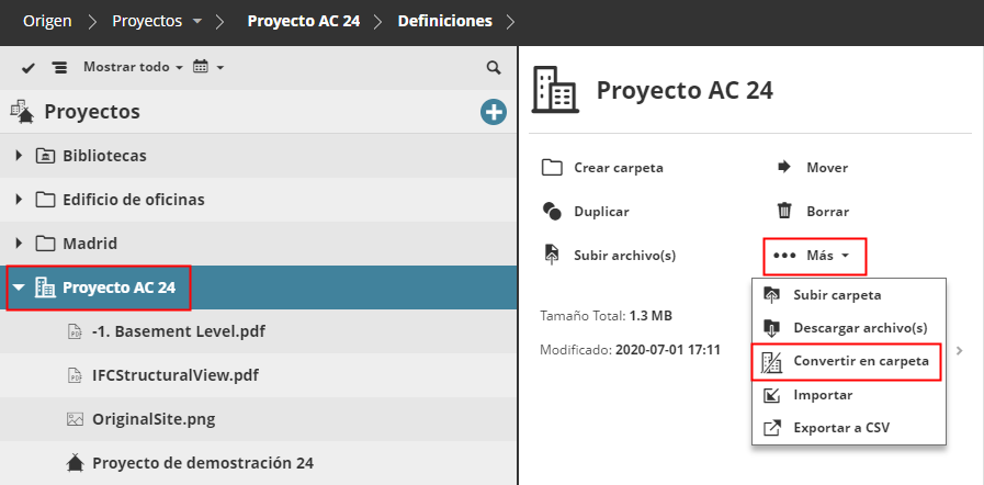 Si su página de Proyectos contiene Proyectos BIMcloud, deberá convertirlos a carpetas ahora. El contenido permanecerá en la carpeta, pero se eliminarán las definiciones de Equipo de los Proyectos BIMcloud.