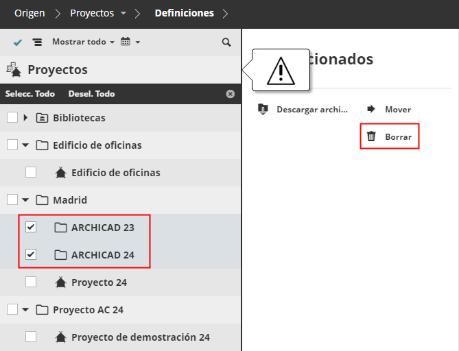 Luego haga clic en Borrar para eliminarlos del BIMcloud Manager.