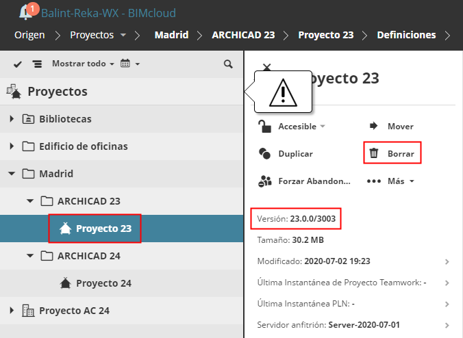 Ahora deberá eliminar todos los proyectos Teamwork incompatibles del BIMcloud Manager - es decir, todos los proyectos compartidos de otras versiones de Archicad: