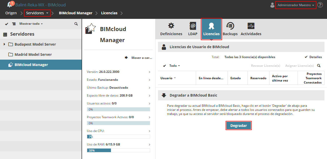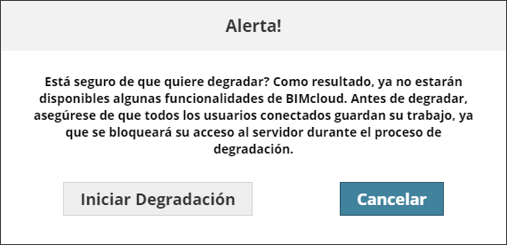 Avise a todos los usuarios que estén conectados al BIMcloud que deben guardar su trabajo. Se bloqueará el acceso al servidor durante el proceso de degradación!