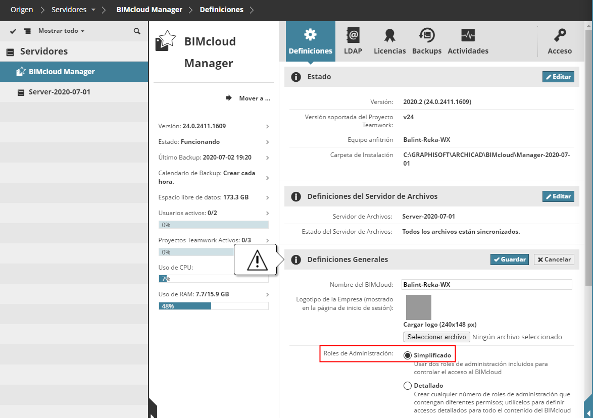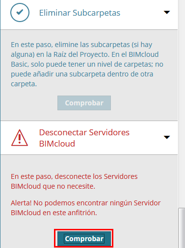 Si este paso se aplica a usted, se mostrará con un triángulo de advertencia rojo, y le llevará automáticamente a la página correcta del BIMcloud Manager, donde podrá ajustar la configuración según las indicaciones.