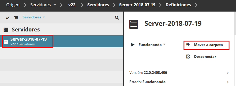 Seleccione el Servidor que esté ubicado en una carpeta.