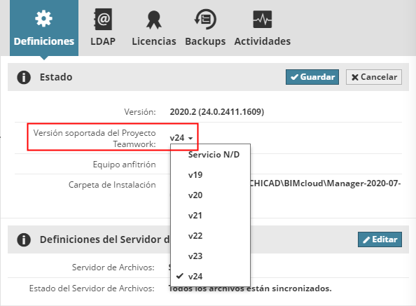 En Versión soportada del Proyecto Teamwork: Elija la versión de Archicad a soportar.