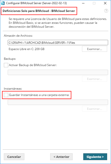 La opción de guardar Instantáneas a una carpeta externa no está disponible en BIMcloud Basic.