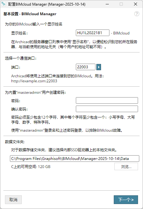 - 主管理員密碼:建立一個用於主管理員 (masteradmin)用戶的安全密碼。該主管理員能夠隨時登錄並完全訪問所有托管的數據。如果您忘了密碼,您必須重新配置您的BIMcloud並輸入新的密碼。