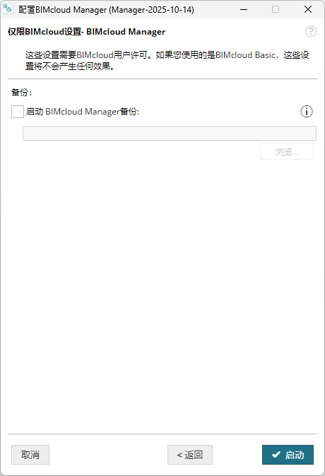 - 啟動 BIMcloud Manager備份: 如果您想要建立BIMcloud Manager數據的備份,請點擊這個方框。點擊此方框之後,您必須輸入(或瀏覽)備份檔案夾位置的路徑。