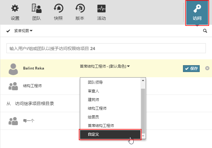 有時它更容易在本地向內容項中的某些人授予一定的權限,而不需要將該權限設定儲存為一個新的常用角色。在這種情況下,當授予訪問權限時,從彈出式對話框中選擇自定義,然後點擊儲存。