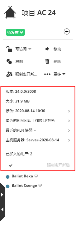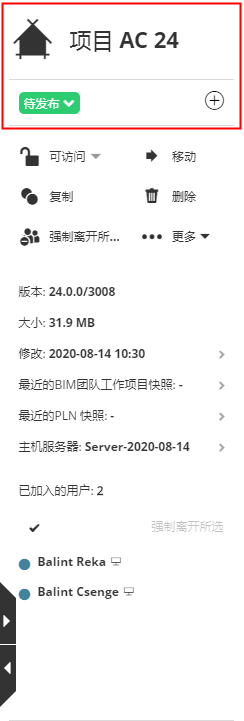 在BIMcloud Manager中選擇任何專案:摘要部分顯示快捷訊息和相關功能。