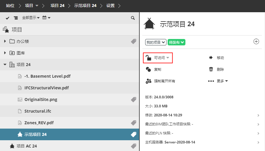 在 BIMcloud 的 "專案 頁面"上,選定專案的狀態會告訴你